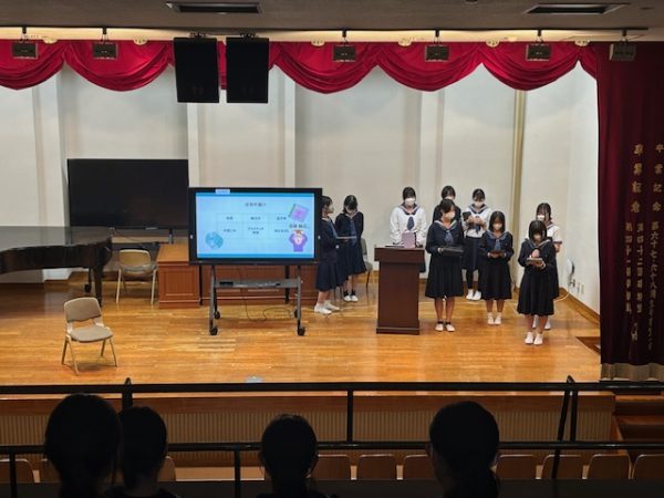テーマは「SDGs」です。各学年ごとにテーマを設定し、環境問題・ジェンダー平等・平和と公正など、身近な社会問題について自分たちなりに考え、調べ、発表を行いました。発表の仕方も多様で、劇やニュース番組風、真剣な研究発表スタイルなど、創意工夫あふれる内容が並びました。どの発表からも、課題を自分ごととしてとらえ、仲間と仲間と協力しながら解決策を模索する姿勢が感じられました。