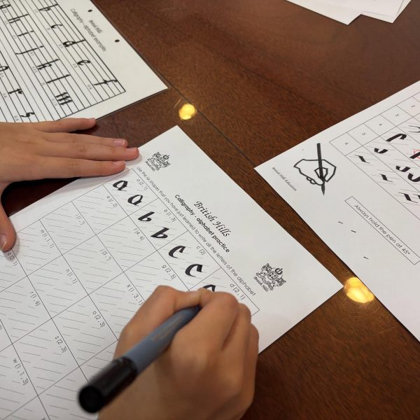 ブリティッシュヒルズ二日目、カリグラフィーに挑戦しました。 カリグラフィーとは、ギリシャ語で「美しい書法」。中世ヨーロッパのアルファベット飾り文字のことです。みんな素敵なカードが出来上がりました!カリグラフィーでは、文字の形や角度に気を配りながらゆっくりと書くことで、普段とは違う集中力が必要で、書く文化の奥深さを感じました。