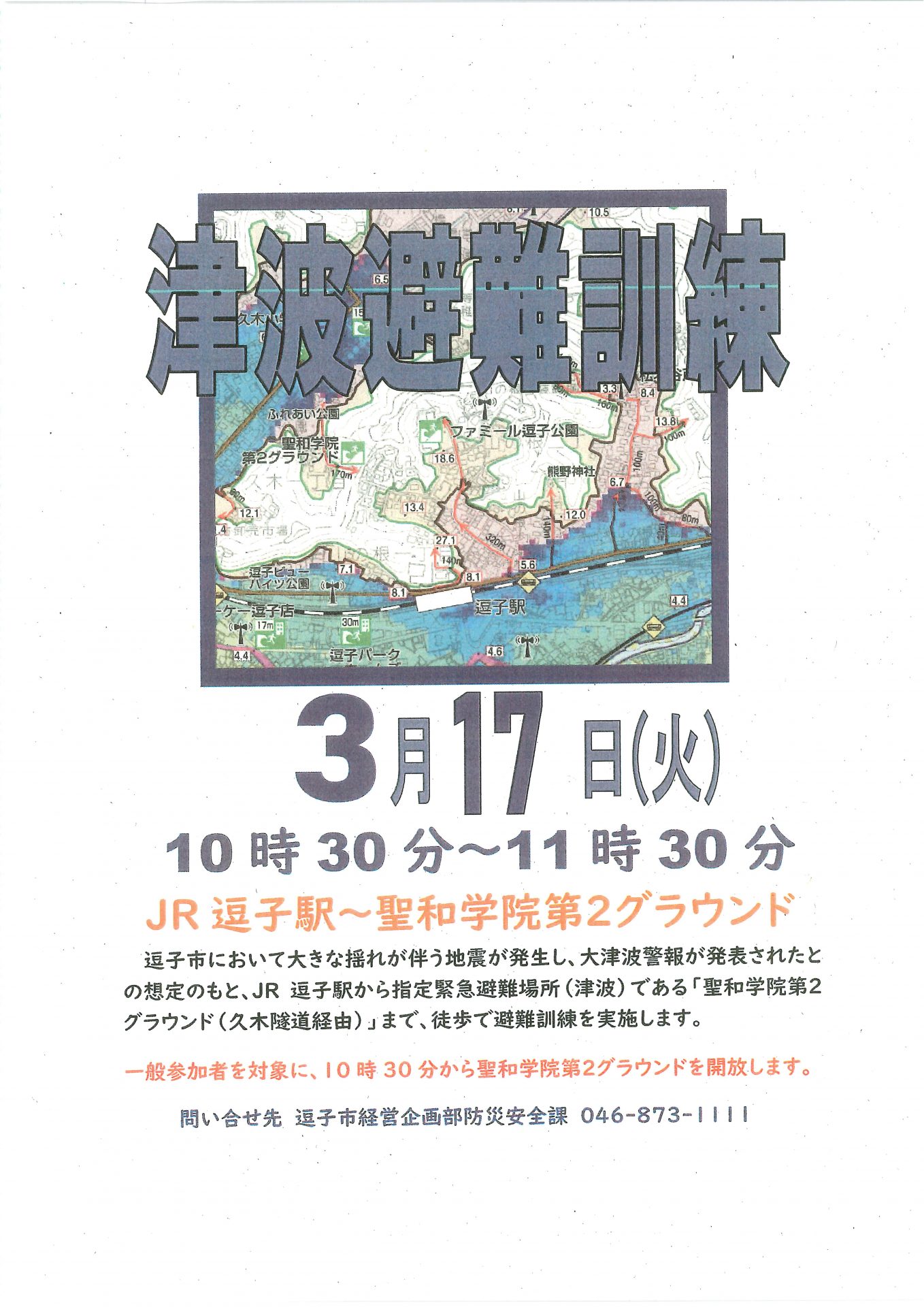明日、3月17日(火)10:30より、逗子市で避難をともなう地震を予測して避難訓練実施します。