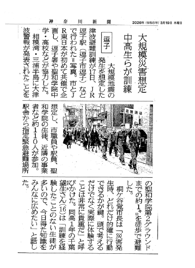 【大規模災害想定訓練3月17日】神奈川新聞に掲載されました(聖和学院中学校・髙等学校)