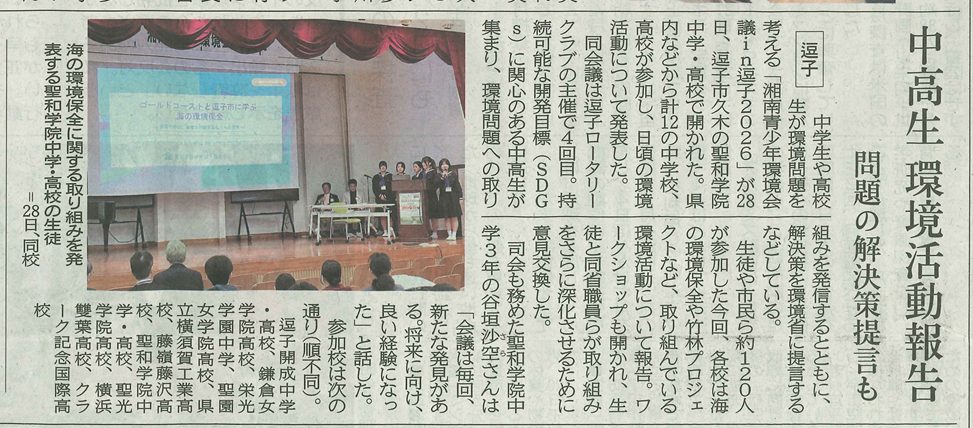 3月28日当校を会場として開催されました、逗子ロータリークラブ主催の中高生による「湘南青少年環境会議 in 逗子 2026」の様子が、神奈川新聞3月30日朝刊に掲載されました!
